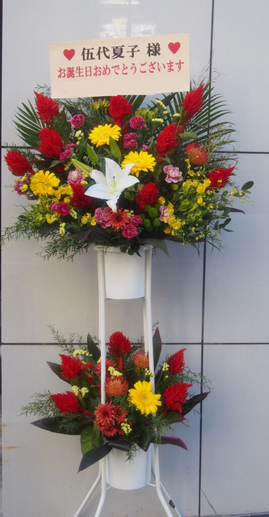 お届け先のイメージによって、みなさまオーダーは様々ですが、近年 2段のスタンド花は少な目で、一段が多いですね。